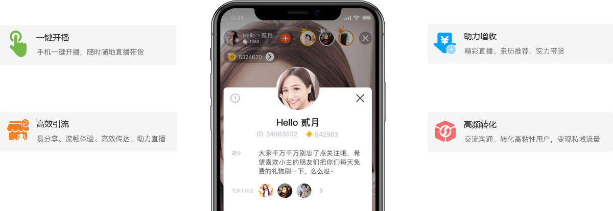 在线观看直播,与直播互动、购买商品,向微信好友分 享推荐直播